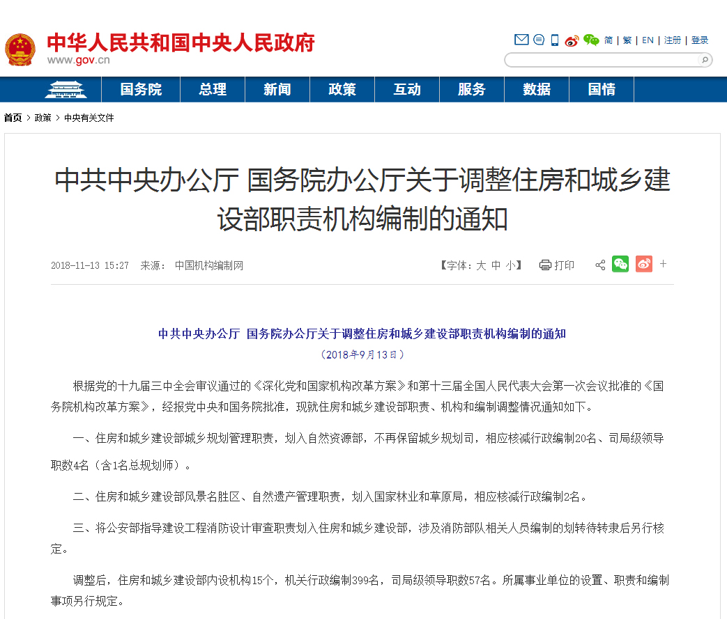 2018年11月13日中國政府網官網公布“中共中央辦公廳 國務院辦公廳關于調整住房和城鄉(xiāng)建設部職責機構編制的通知”,將公安部指導建設工程消防設計審查職責劃入住房和城鄉(xiāng)建設部,涉及消防部隊相關人員編制的劃轉待轉隸后另行核定。