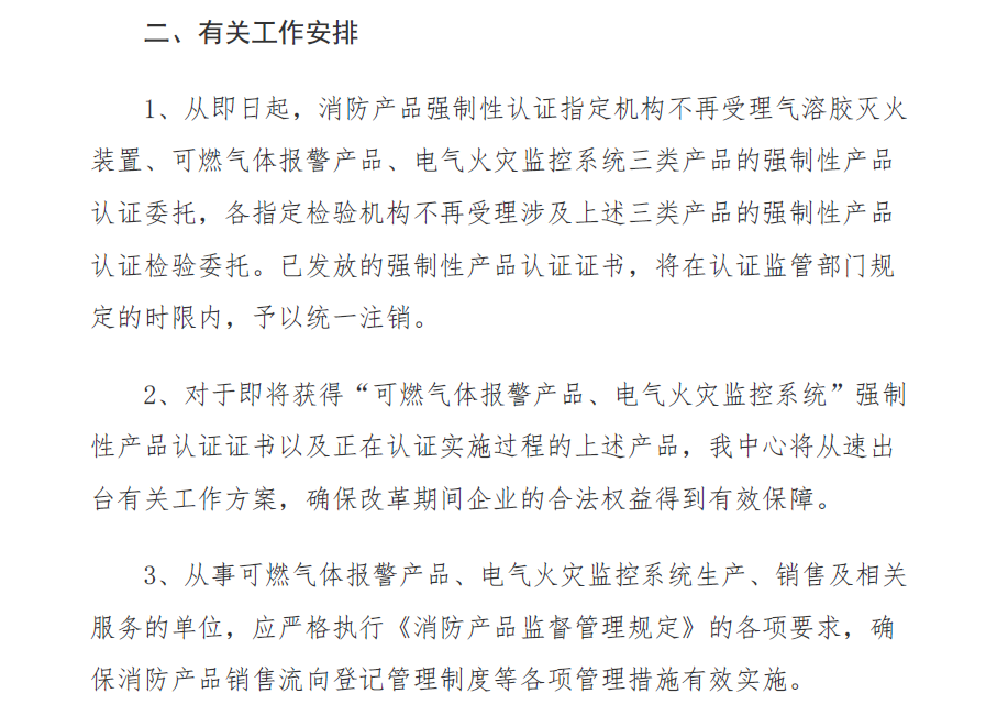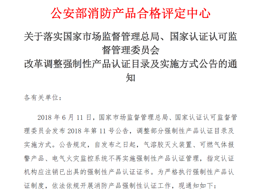 公告規(guī)定,自發(fā)布之日起,3類消防產(chǎn)品即氣溶膠滅火裝置、可燃?xì)怏w報(bào)警產(chǎn)品、電氣火災(zāi)監(jiān)控系統(tǒng)不再實(shí)施強(qiáng)制性產(chǎn)品認(rèn)證管理,指定認(rèn)證機(jī)構(gòu)應(yīng)注銷已出具的強(qiáng)制性產(chǎn)品認(rèn)證證書。同時(shí)國(guó)家認(rèn)監(jiān)委注銷相關(guān)認(rèn)證機(jī)構(gòu)和實(shí)驗(yàn)室所涉及的強(qiáng)制性產(chǎn)品認(rèn)證指定業(yè)務(wù)范圍。