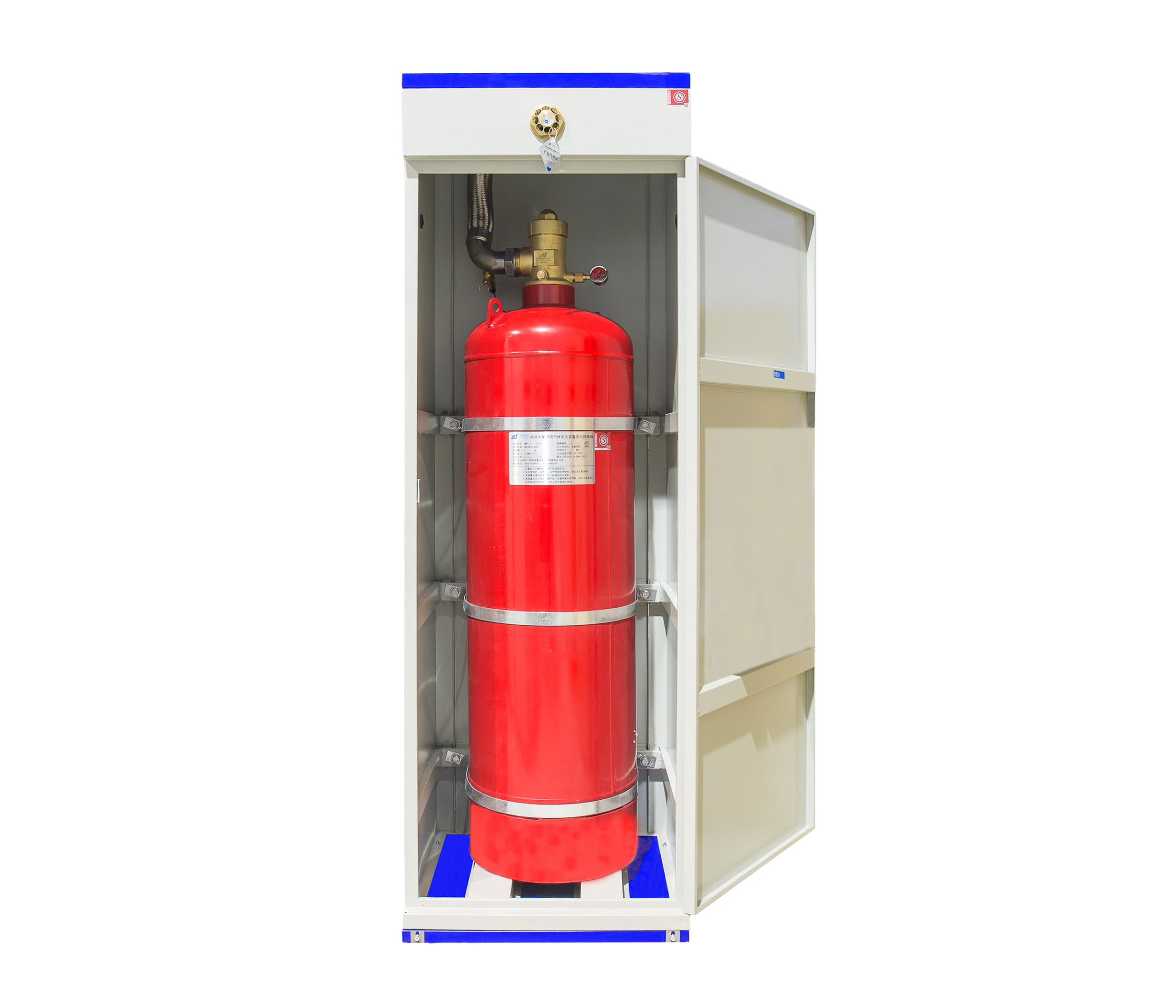柜式七氟丙烷氣體滅火裝置以潔凈氣體七氟丙烷(HFC227ea)為滅火劑,由柜體、容器瓶、容器閥、電磁驅(qū)動(dòng)器、連接管、噴嘴、信號(hào)反饋裝置、壓力表、安全泄放裝置等組成,無需安裝滅火劑輸送管網(wǎng)。滅火裝置啟動(dòng)后,直接將滅火劑噴放到防護(hù)區(qū)內(nèi),具有滅火效率高、滅火后無殘留等優(yōu)點(diǎn)。