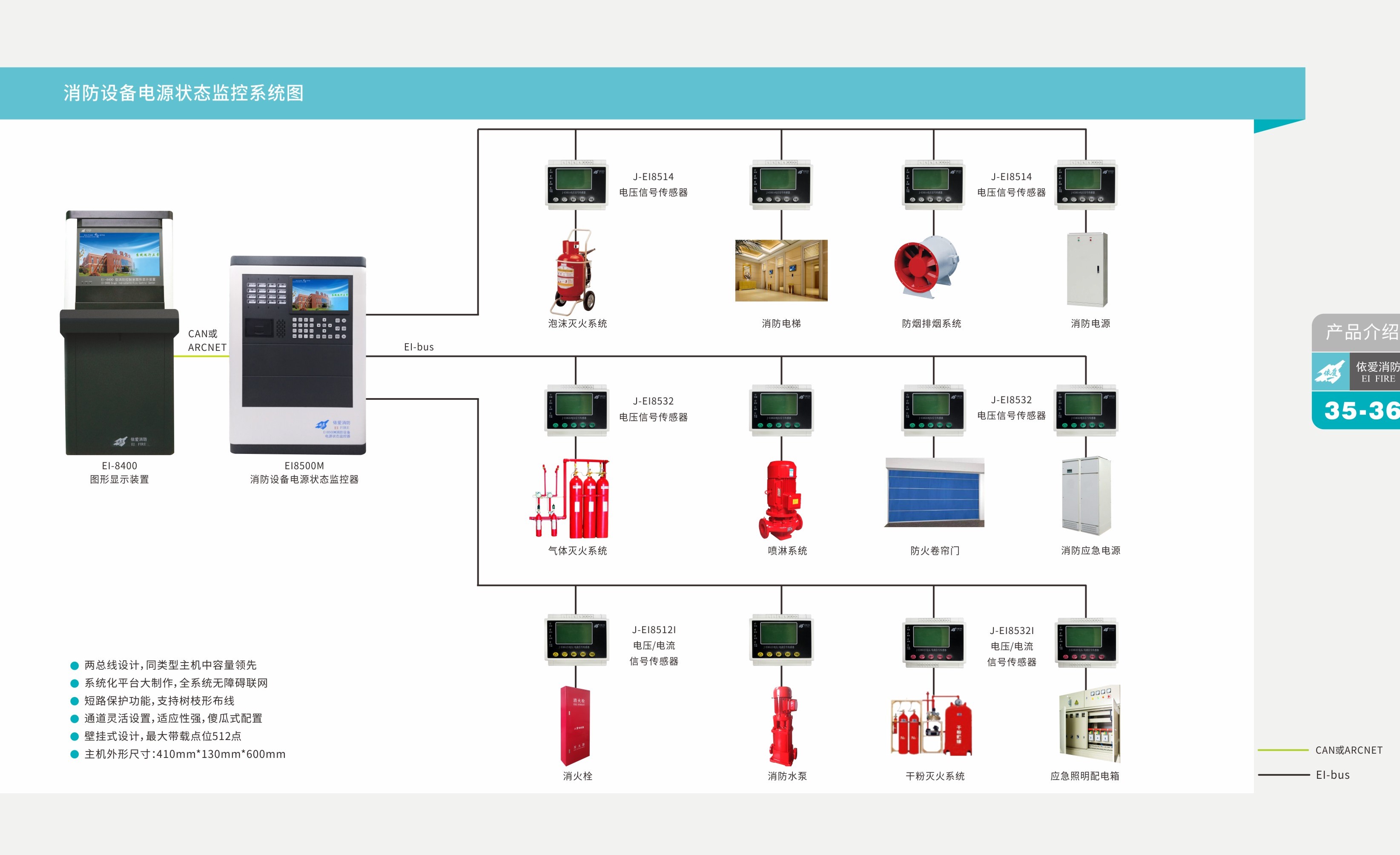 消防設備電源狀態(tài)監(jiān)控系統(tǒng)作為消防聯(lián)動控制系統(tǒng)的必要子系統(tǒng),一般設置在消防控制中心,由消防設備電源狀態(tài)監(jiān)控器,電源總線,通訊總線和其連接的電壓信號傳感器、電流/電壓信號傳感器、中繼模塊箱等設備組成。