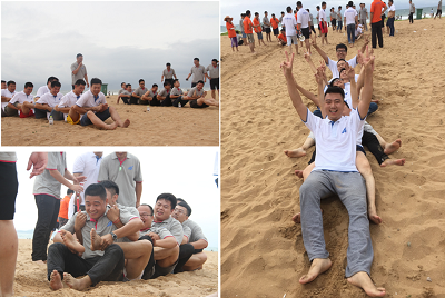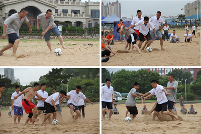 通過前面三個緊張的比賽之后,決出了四個隊伍進(jìn)行終極項目—沙灘足球比賽。比賽中我們?nèi)w成員手拉手圍出了一個足球場,大家既是邊界,又是觀眾,參與感非常強(qiáng)。每一次斷球,都有搶奪競爭對手客戶時的喜悅;每一次傳球,都是團(tuán)隊隊員相互之間的信任;每一次帶球奔馳,都像手握項目漏斗有底氣;最后的臨門一腳,像揮灑汗水拿到了訂單,充滿了愉悅??粗蠹以诮鹕成吓ζ床臉幼?,我們激情高漲,抬頭看了看海的遠(yuǎn)方,心中充滿了愛與喜悅。